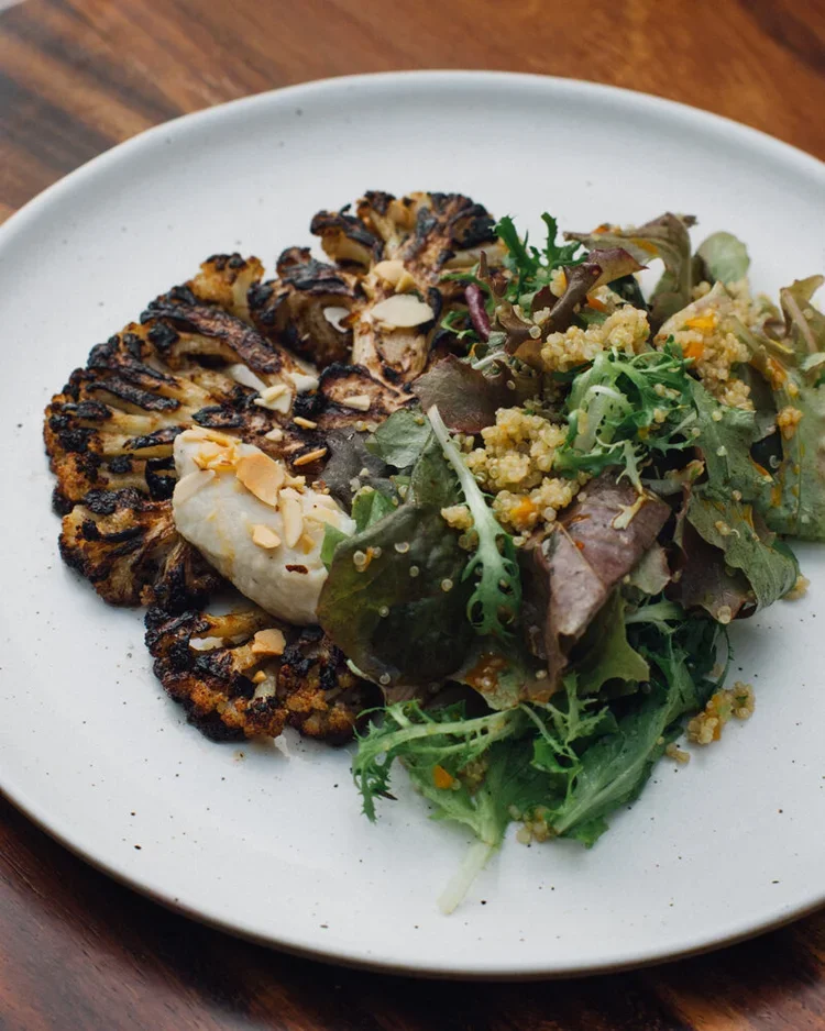 Roasted cauliflower and cauliflower purée with mixed lettuce, quinoa and almonds. 200g.